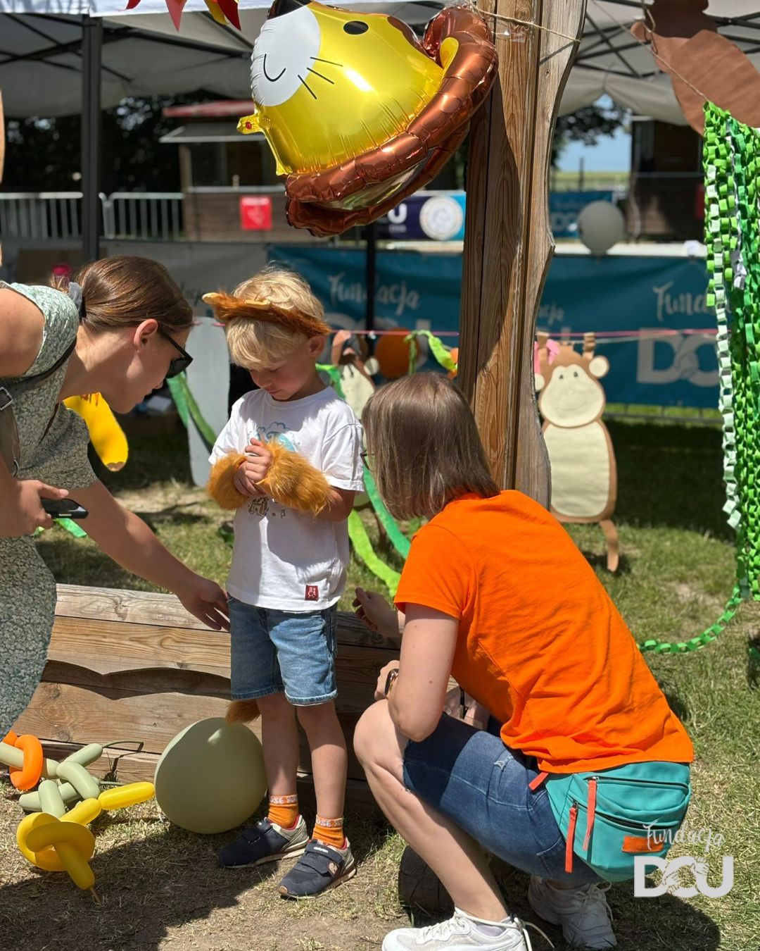 Nasz fundacyjny namiot stał się miejscem pełnym atrakcji. Ogromnym zainteresowaniem cieszyła się fotobudka z lwem – naszą fundacyjną maskotką, która była idealnym miejscem do pamiątkowych zdjęć. Przy kole fortuny każdy mógł spróbować swojego szczęścia i wylosować fantastyczne nagrody – od dmuchanych balonów, przez kolorowe naklejki, aż po brokatowe tatuaże, które podbiły serca nie tylko dzieci!